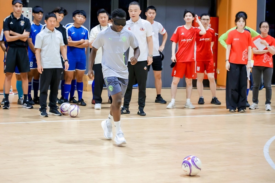 接下来的盲人足球互动环节,明日之星冠军杯球员、东方红球迷代表戴上眼罩,与盲人队的孩子们共同体验了一堂特别的盲人足球训练课。在盲人足球队教练的指导下,大家进行了带球跑位、听声触球、攻防射门等一系列盲人足球技巧体验,大家相互鼓励,彼此做每个人的“眼睛”,团结和信任在此刻变得具象化。